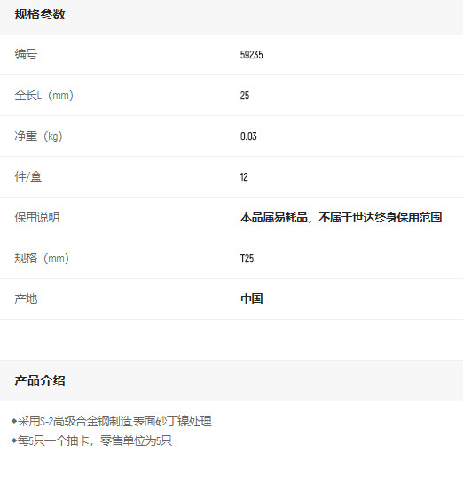 首頁>產品中心>螺絲批>旋具頭組套>世達5件6.3mm系列長花形旋頭T25